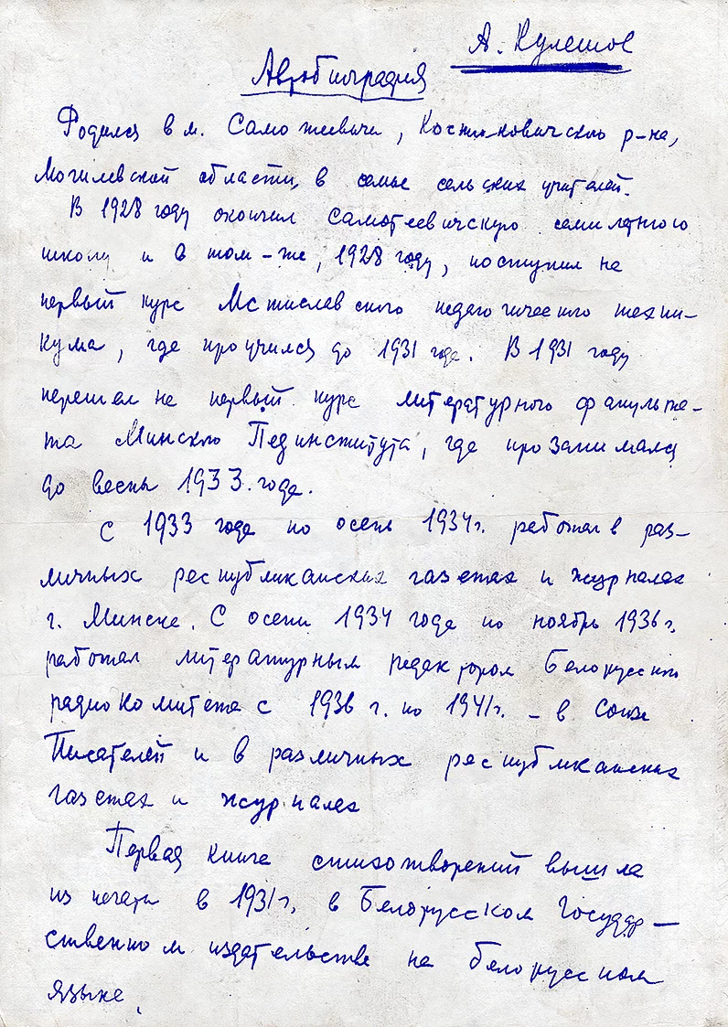 Рукапіс аўтабіяграфіі А. Куляшова. Першы ліст. |