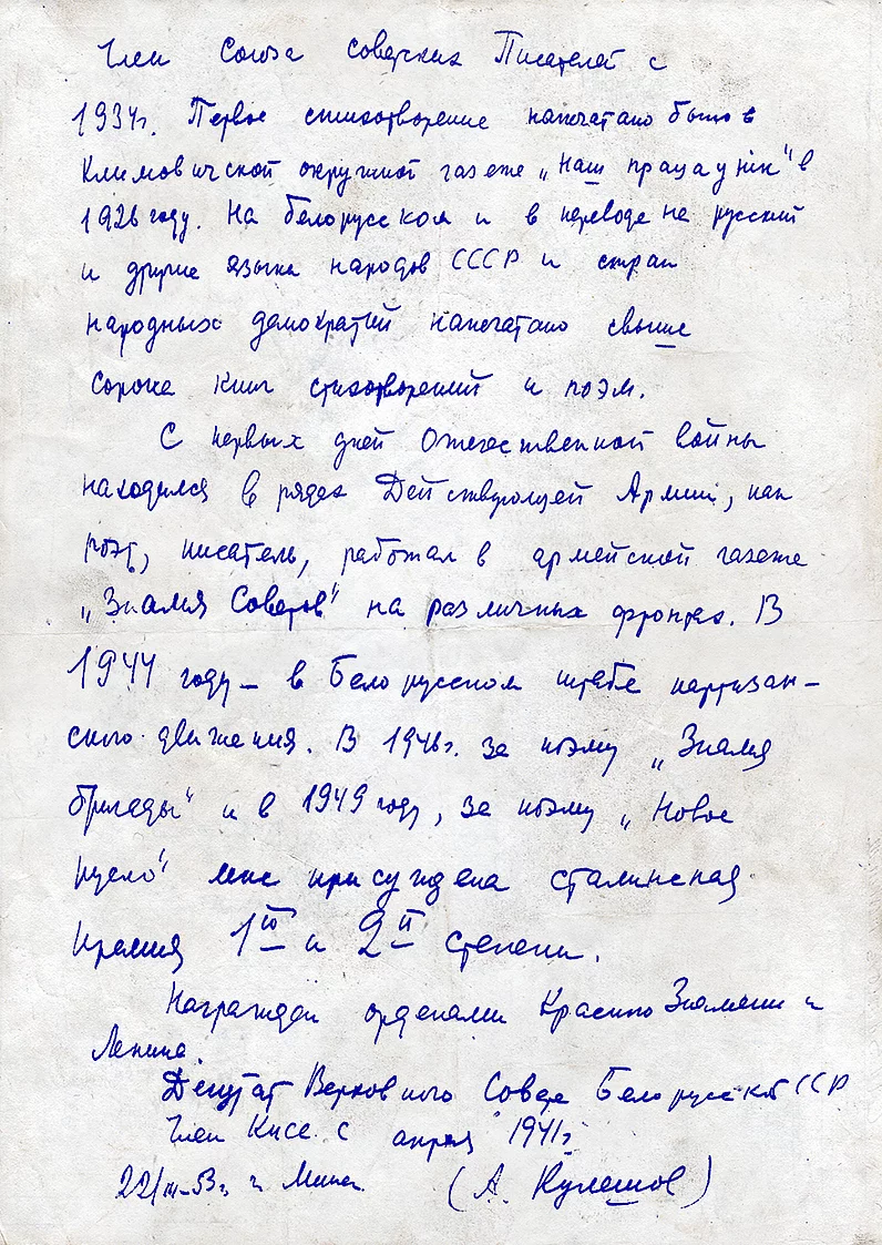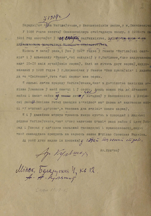 Рукапіс аўтабіяграфіі А. Куляшова. Другі ліст. |