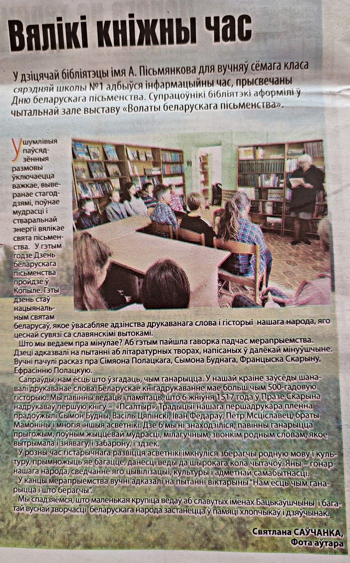 9. Саўчанка, С. Вялікі кніжны час / Святлана Саўчанка // Голас Касцюкоўшчыны. — 2021. — 4 верасня. — С. 12.