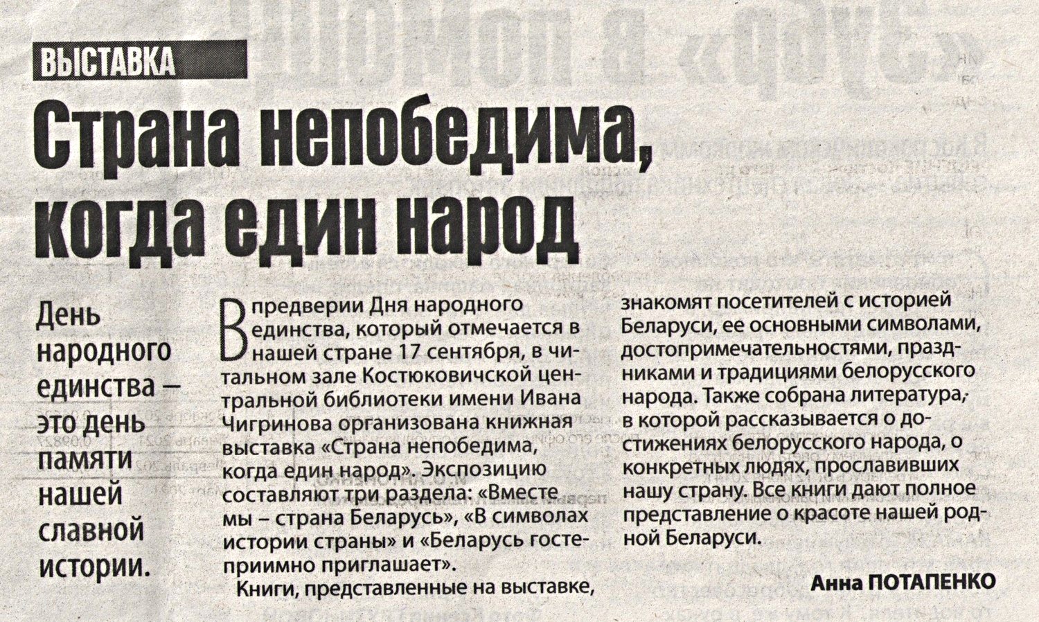 8. Выставка ко Дню народного единства открылась в Костюковичской центральной библиотеке им. И. Чигринова [Электронный ресурс] // Голас Касцюкоўшчыны : сайт. — Режим доступа: https://golk.by/v-kostjukovichskoj-centralnoj-biblioteke-im-i-chegrinova-prohodit-vystavka-strana-nepobedima-kogda-edin-narod.html. – Дата доступа: 14.09.2021.