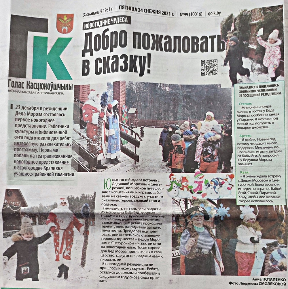 1. Потапенко, А. Добро пожаловать в сказку! / Анна Потапенко // Голас Касцюкоўшчыны. — 2021. — 24 снежня. — С. 1.