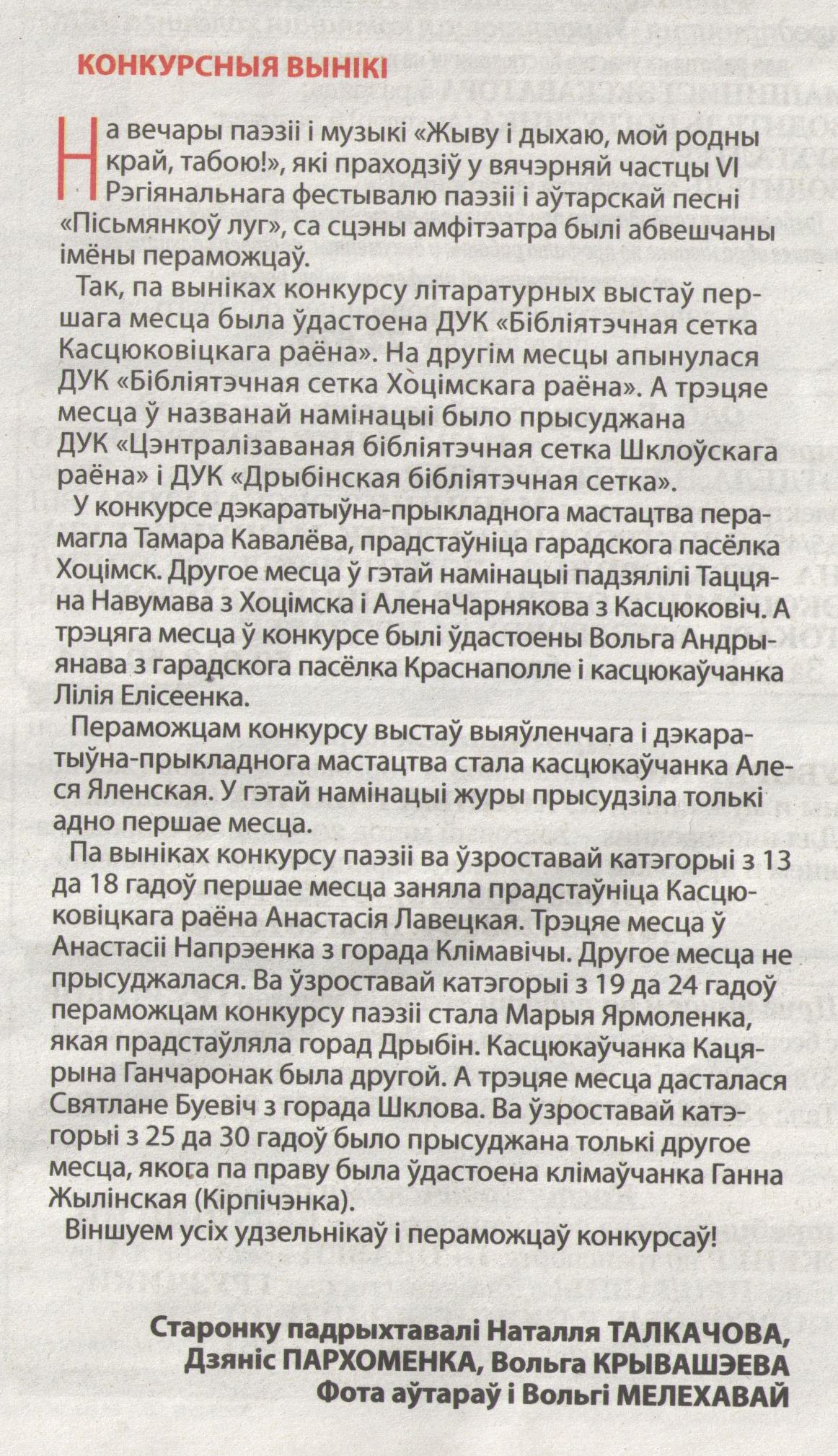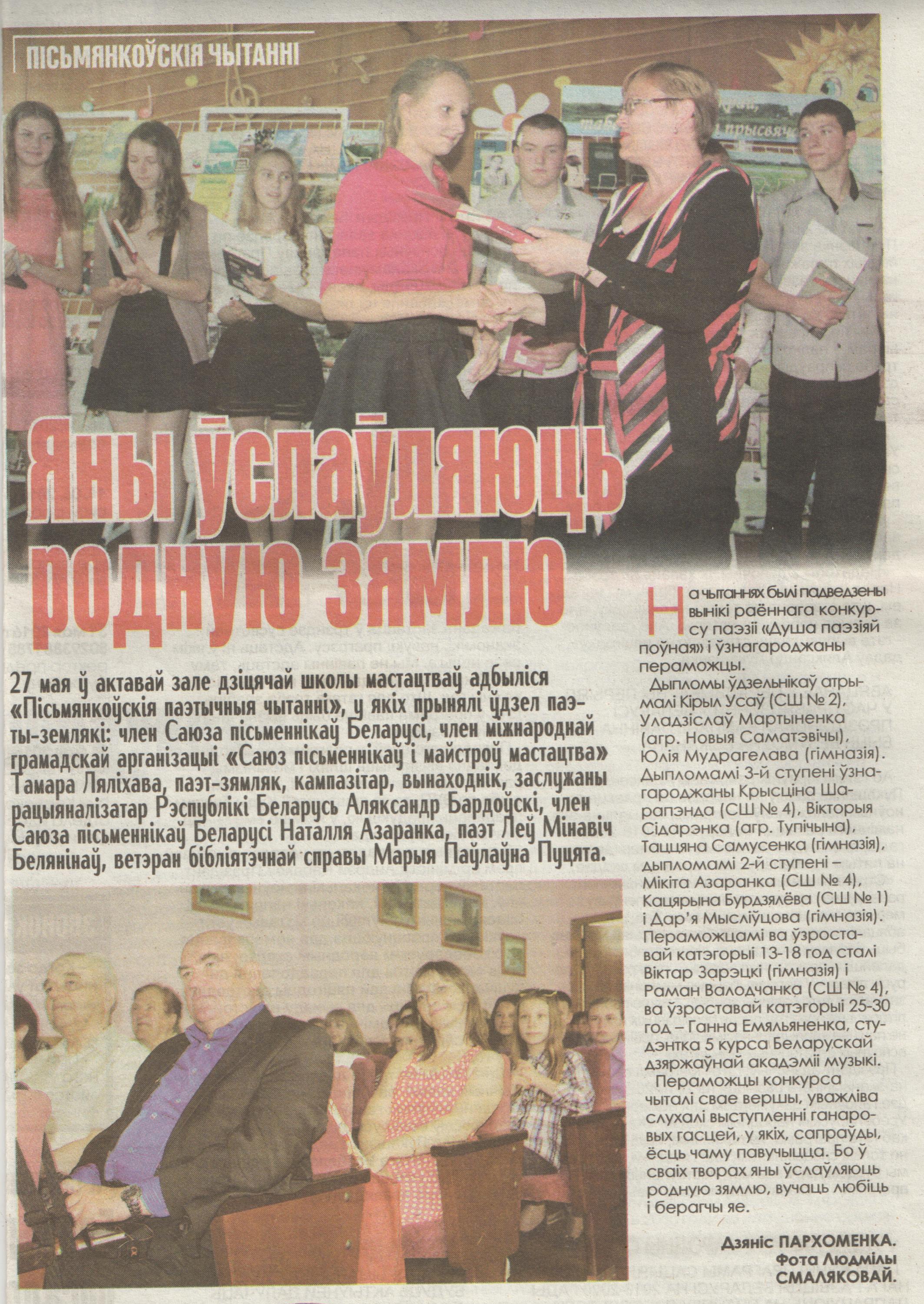 24. Дробышава, Н. На “Пісьмянковм лузе” зноў талентаў парад / Наталля Дробышава // Культура. — 2013. — 1 чэрвеня. — С. 4.
