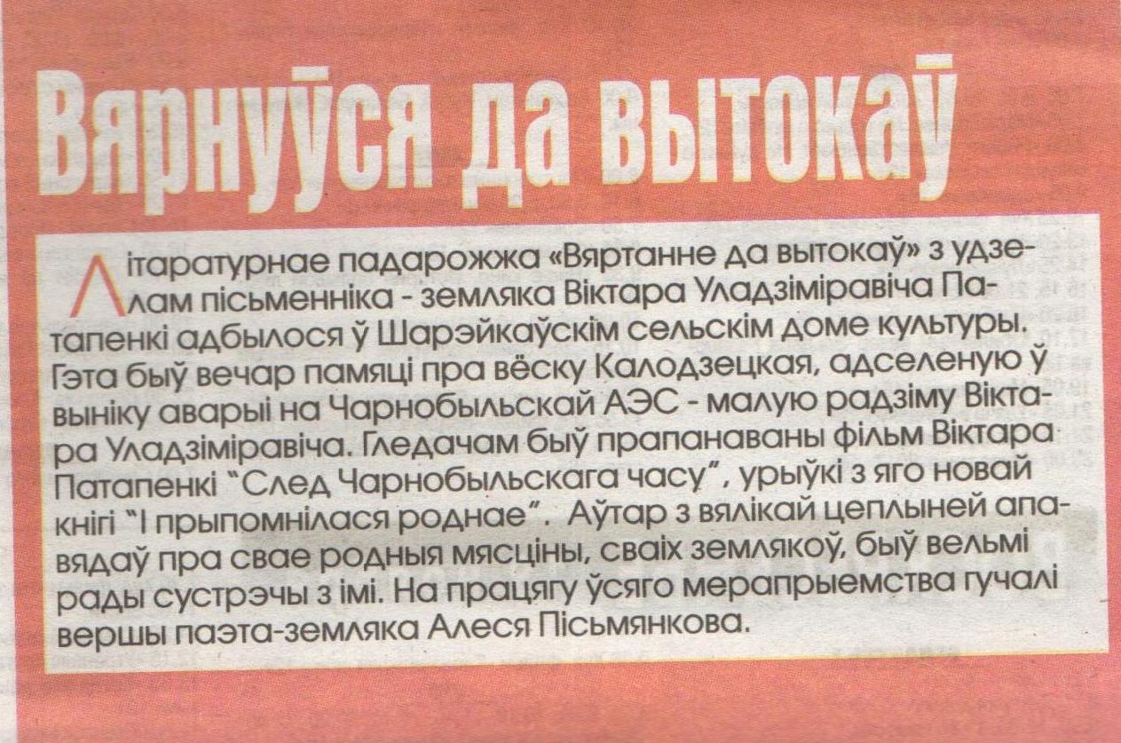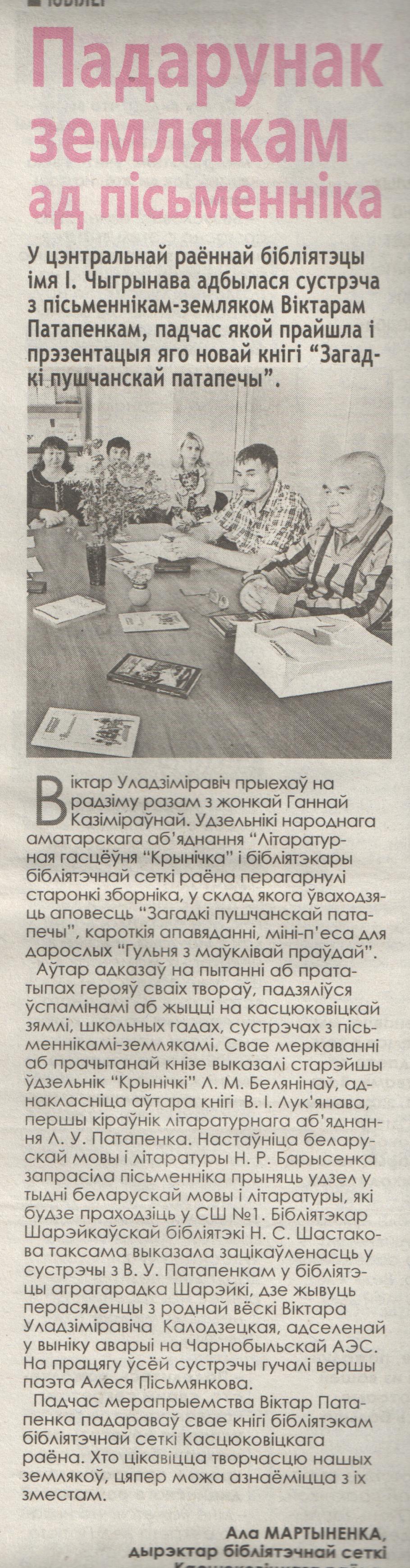 15. Шаршнёва, Т. У гасцях быў пісьменнік / Т. Шаршнёва, М. Казадоева // Голас Касцюкоўшчыны. — 2014. — 4 чэрвеня. — С. 5.