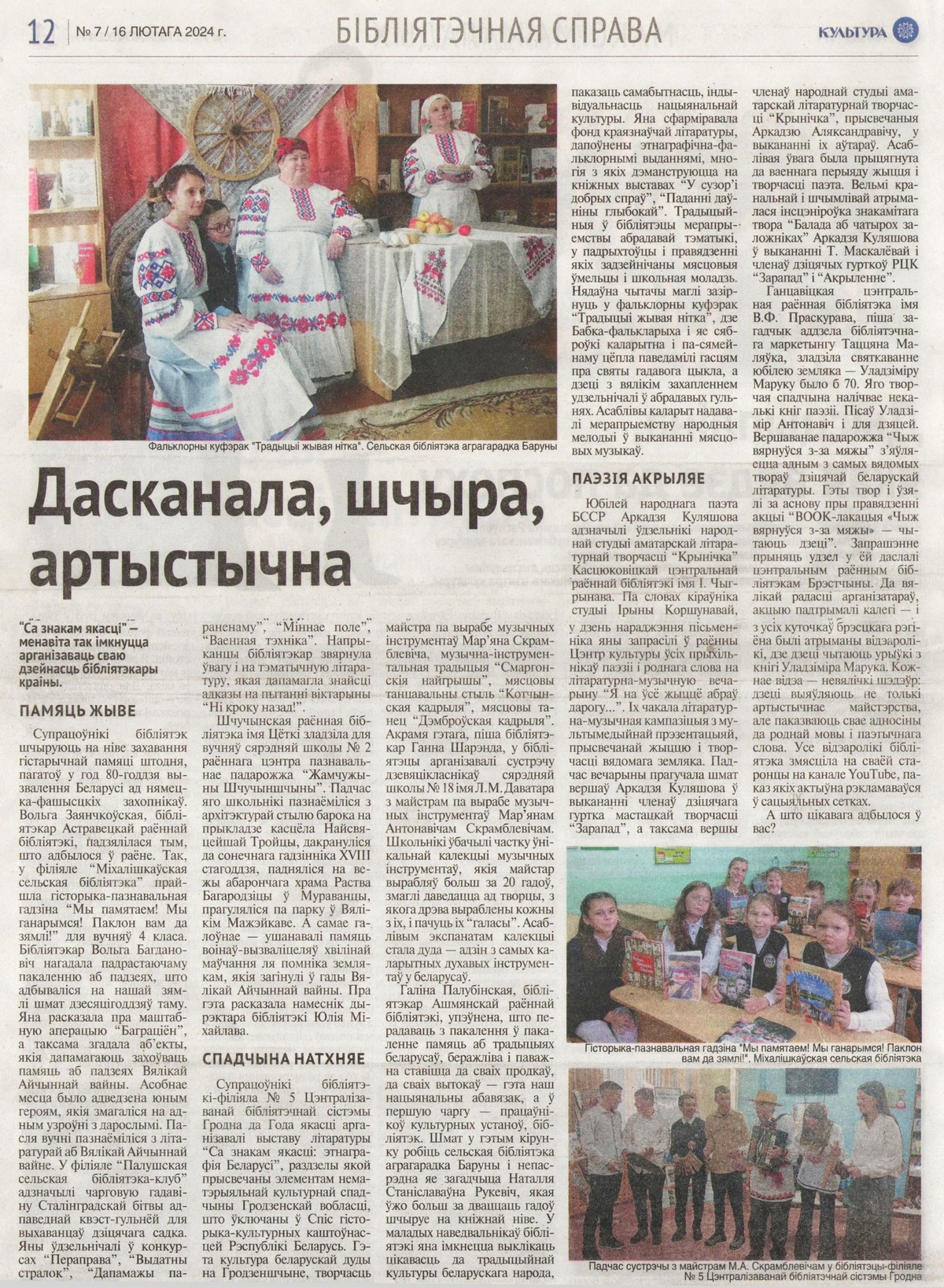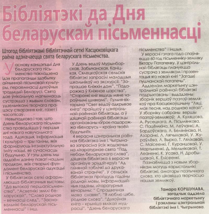 26. Сырамалотава, Ю. Галоўны скарб народа / Юлія Сырамалотава // Голас Касцюкоўшчыны. — 2013. — 27 ліпеня. — С. 1.