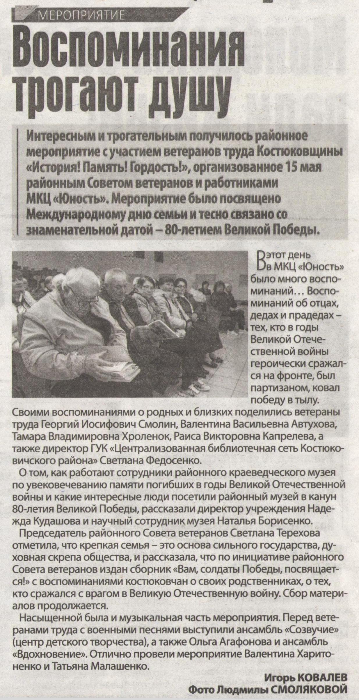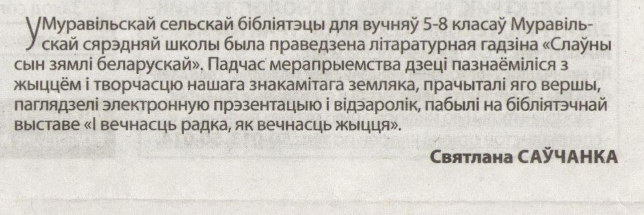 23. Муращенко, Л. Встреча поколений. 70 мирных лет / Людмила Муращенко // Голас Касцюкоўшчыны. — 2015. — 14 сакавіка. — С. 8.