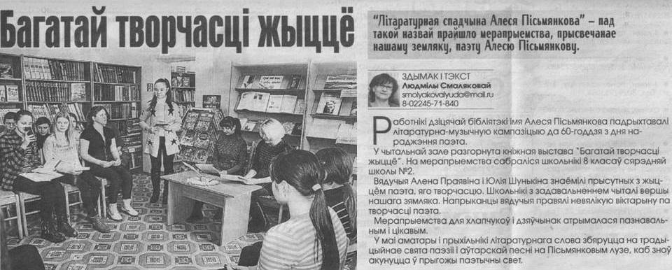 23. Падліпская, Т. На “Пісьмянковым лузе” гучалі вершы… / Т. Падліпская // Могилёвские ведомости. — 2013. — 30 мая. — С. 4.