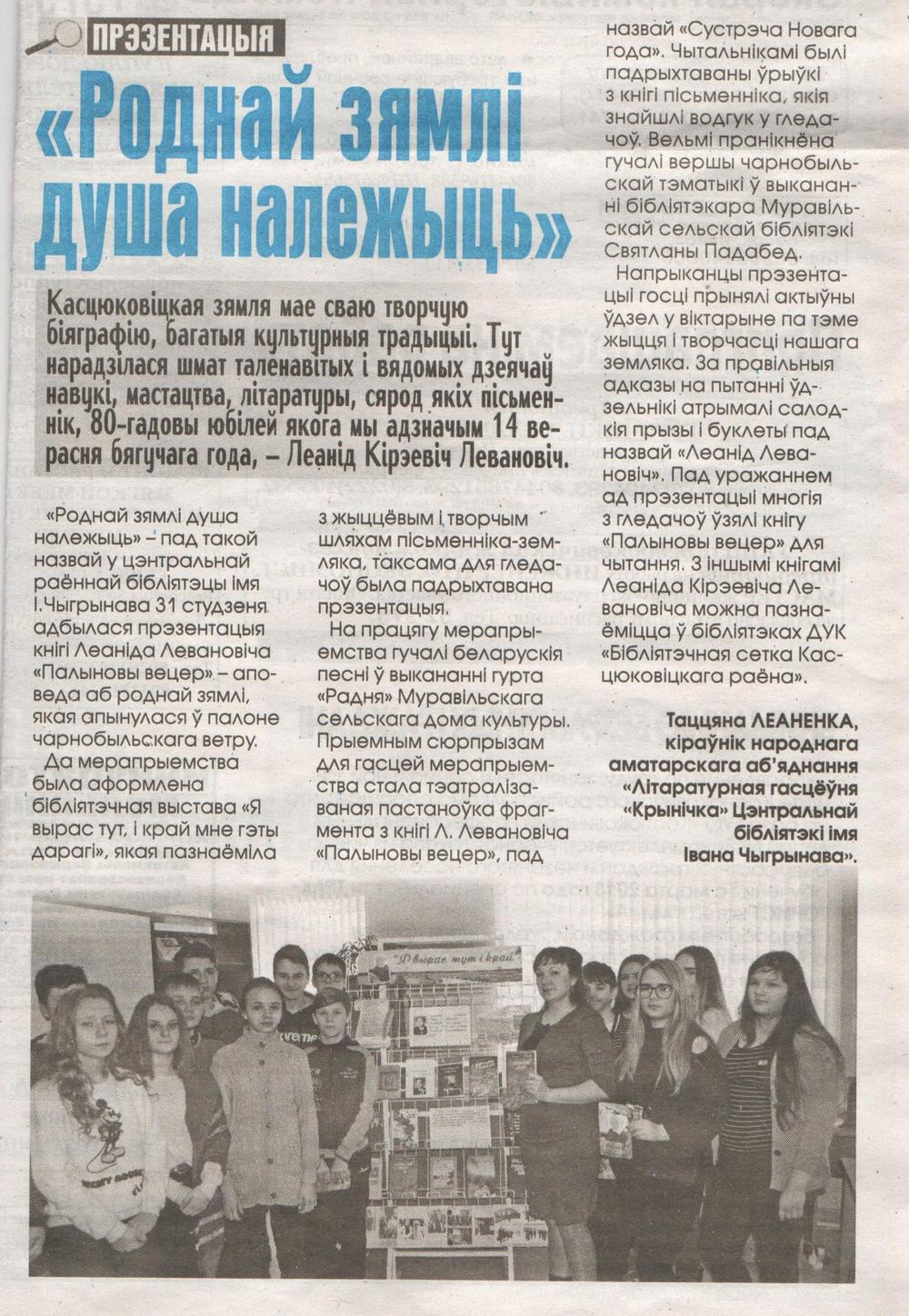 15. Леаненка, Т. Роднай зямлі душа належыць / Таццяна Леаненка // Голас Касцюкоўшчыны. — 2018. — 7 лютага. — С. 5.
