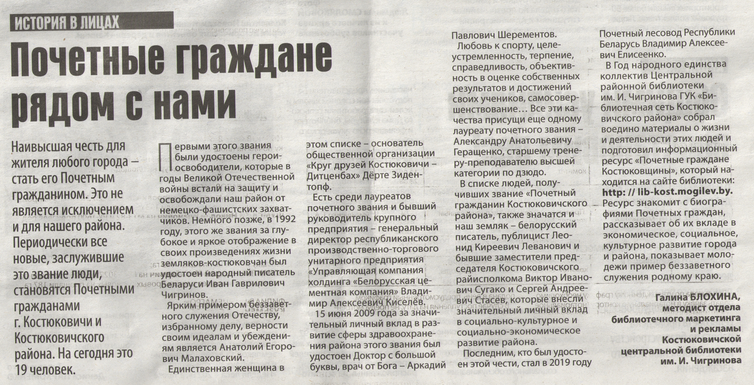 13. Блохина, Г. Почётные граждане рядом с нами / Галина Блохина // Голас Касцюкоўшчыны. — 2021. — 7 красавіка. — С. 3.