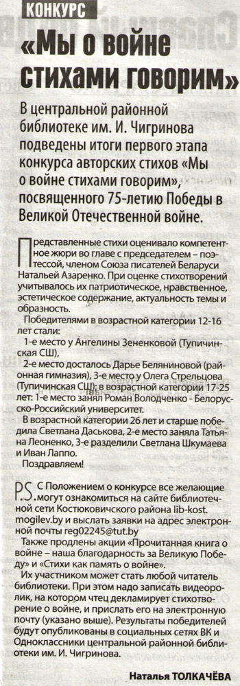 2. Толкачева, Н. «Мы о войне стихами говорим» / Наталья Толкачева // Голас Касцюкоўшчыны. — 2020. — 8 мая. — С. 5.