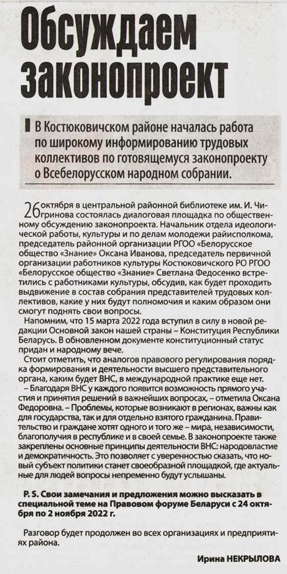 4. Некрылова, И. Обсуждаем законопроект / Ирина Некрылова // Голас Касцюкоўшчыны. — 2022. — 29 кастрычніка. — С. 2.