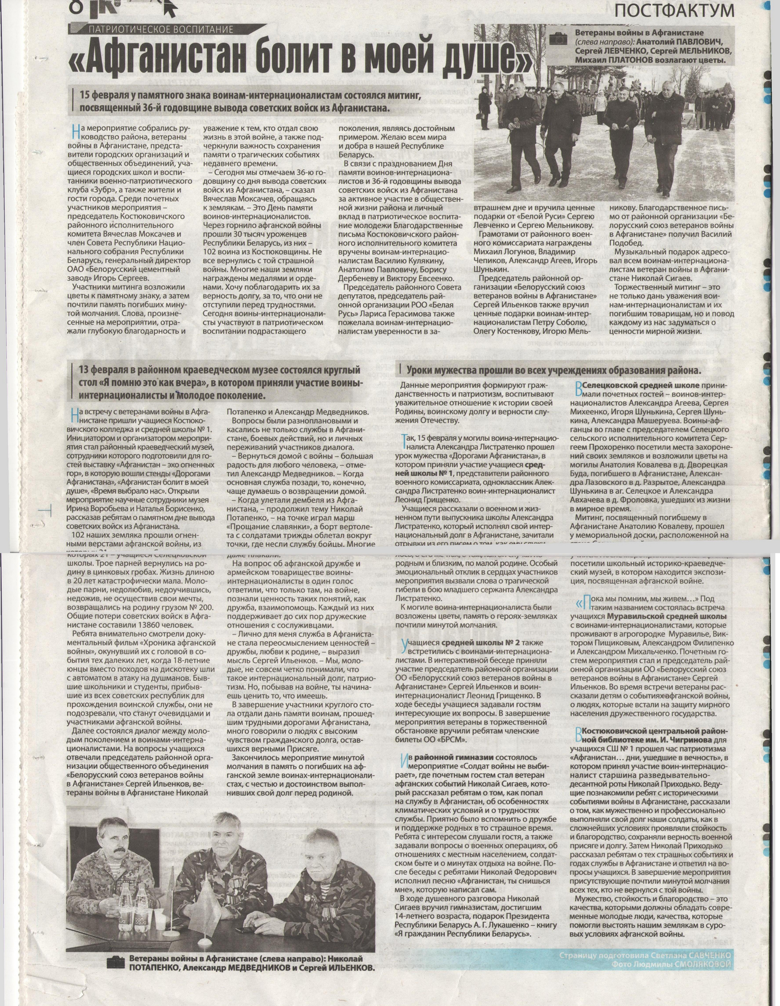 26. Защитникам Отечества посвящалось // Голас Касцюкоўшчыны. — 2015. — 25 лютага. — С. 1, 3.