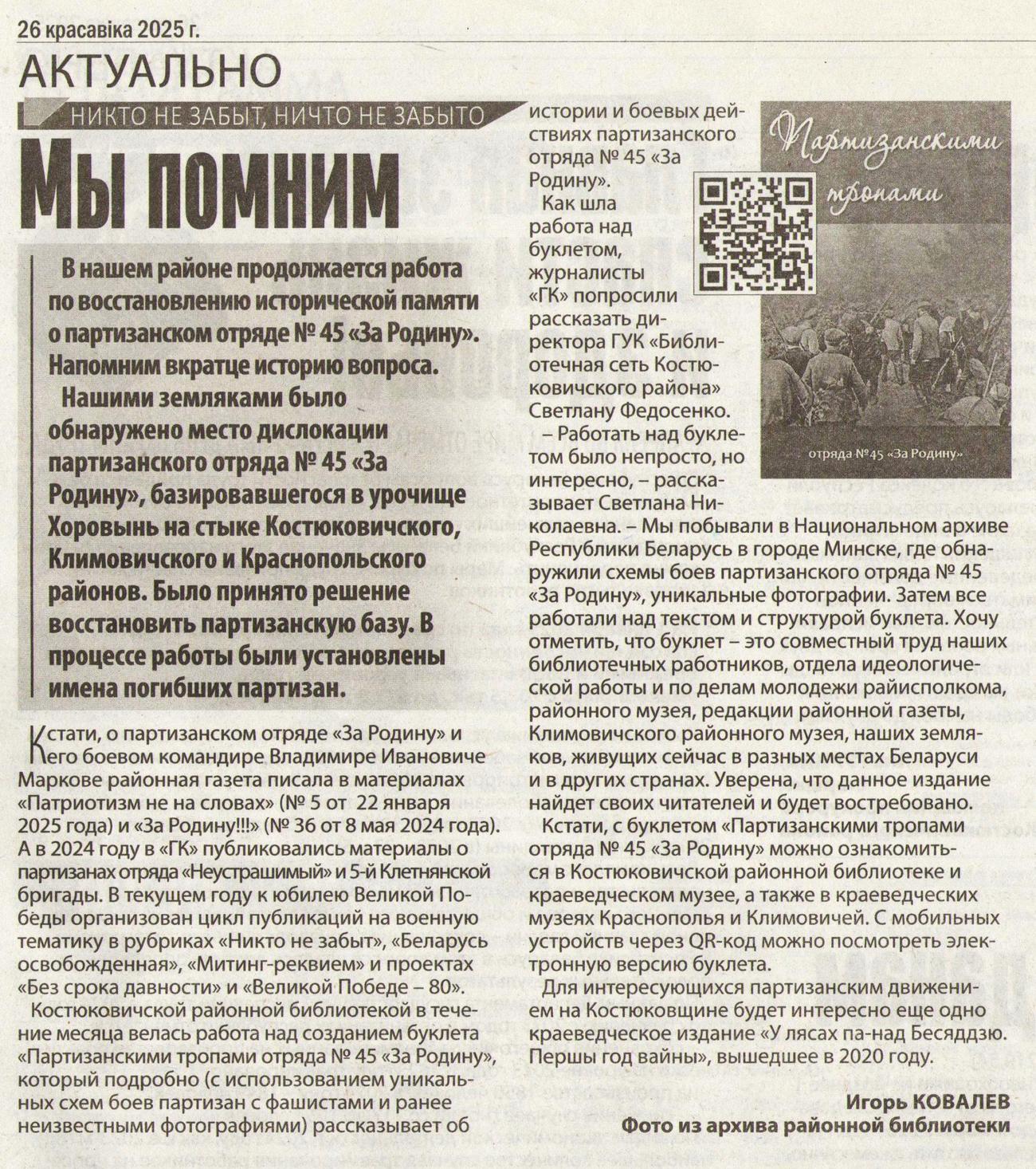 21. Ковалев, И. Мы помним / Игорь Ковалев // Голас Касцюкоўшчыны. — 2025. — 26 красавіка. — С. 3.