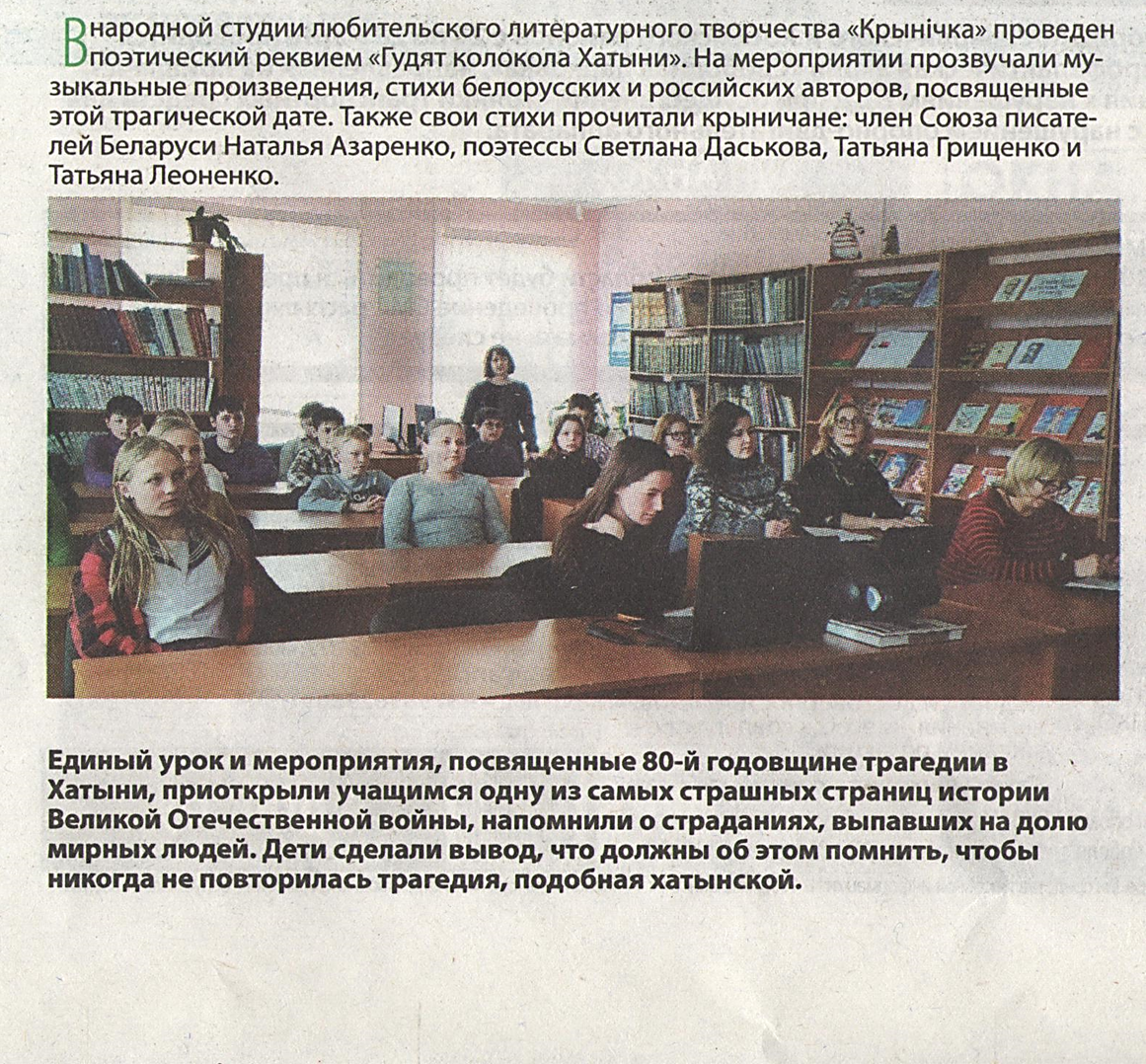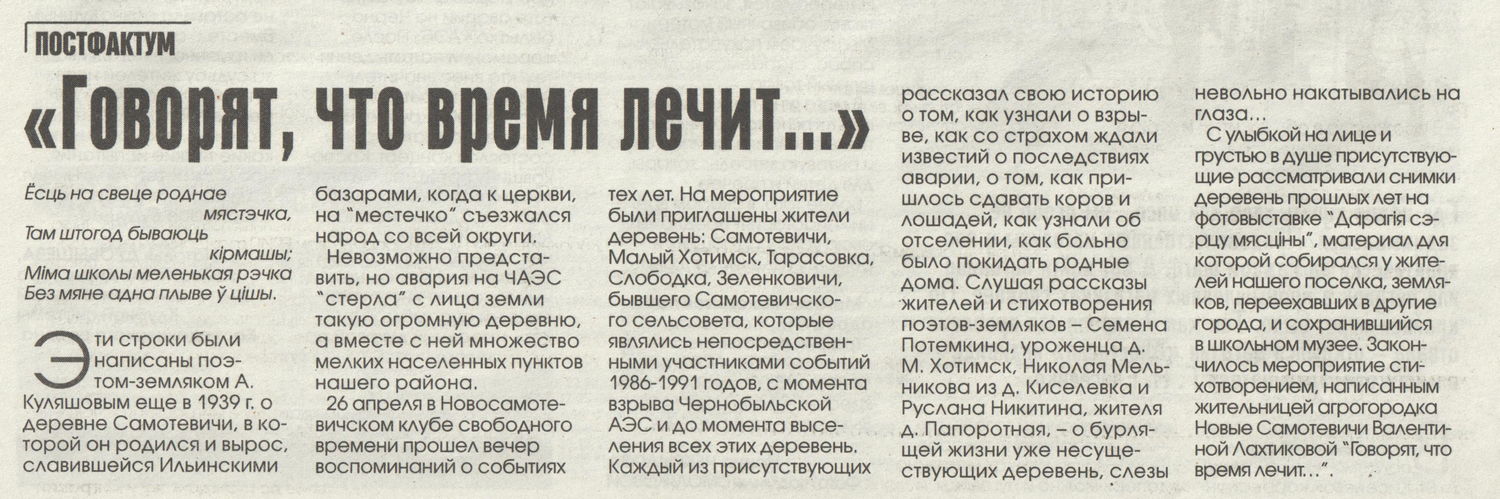 12. Савченко, С. Звенящая болью история / Светлана Савченко, Анна Потапенко // Голас Касцюкоўшчыны. — 2023. — 25 сакавіка. — С. 12.