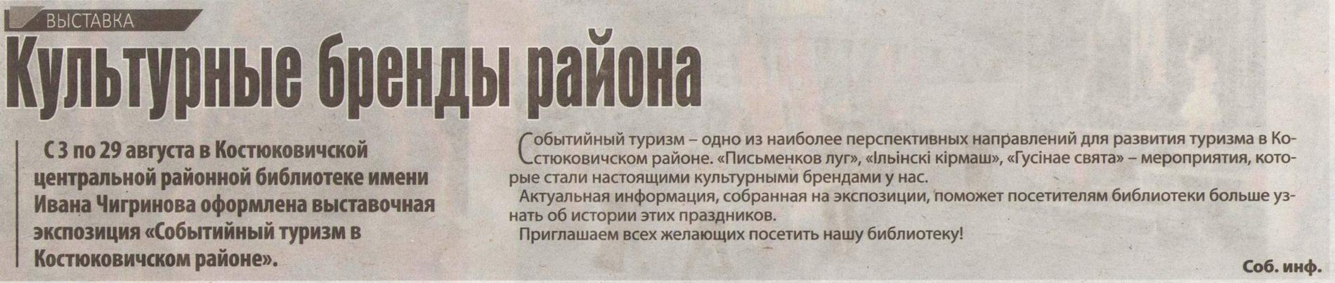 27. Петрусевич, И. Эффективная работа дает эффективный результат. Итоги работы культуры за 2014 год / Ирина Петрусевич // Голас Касцюкоўшчыны. — 2015. — 11 лютага. — С. 1, 5.