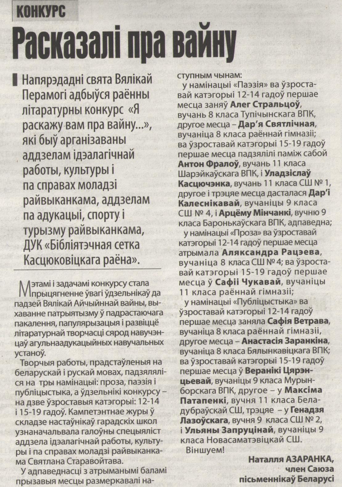11. Азаранка, Н. Расказалі пра вайну / Наталля Азаранка // Голас Касцюкоўшчыны. — 2022. — 7 мая. — С. 4.