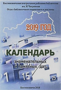 Календарь знаменательных и памятных дат на 2019 год [Текст]: к планированию работы библиотек / Государственное учреждение культуры «Библиотечная сеть Костюковичского района», Отдел библиотечного маркетинга и библиотечной рекламы ; [составитель С.Н. Федосенко ; ответственный за выпуск А.Е. Мартыненко].— Костюковичи : Центральная библиотека имени И. Чигринова, 2018.— 48 с.
